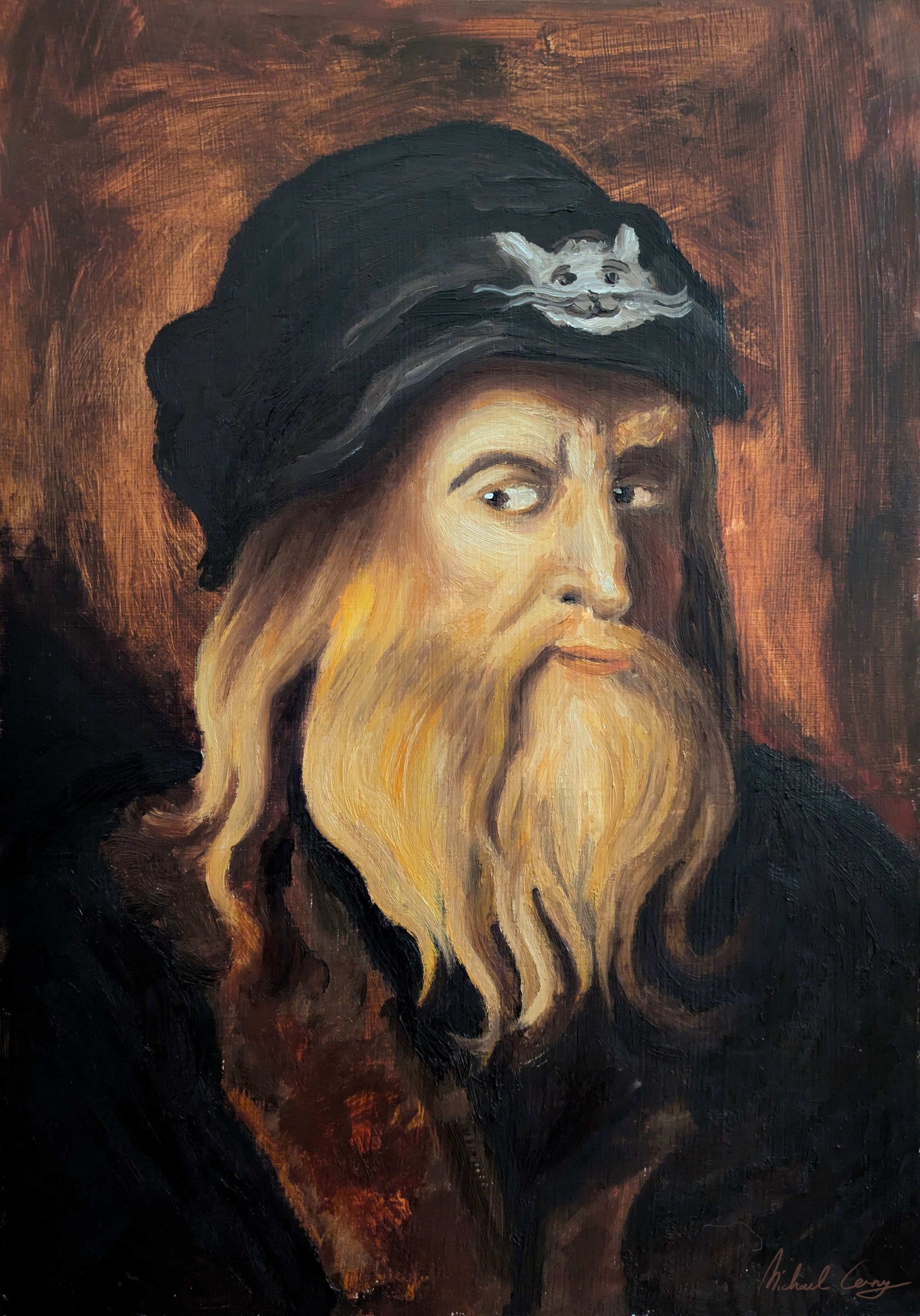 With this painting I wanted to create something humorous as well as wholesome - it's a reimagination of one of DaVinci's self-portraits, with a little twist: His smirk and his side-eyed gaze off canvas suggest that he knows something we don't know. Did he, perhaps, have a hunch about the importance of the feline spirit in our culture today?